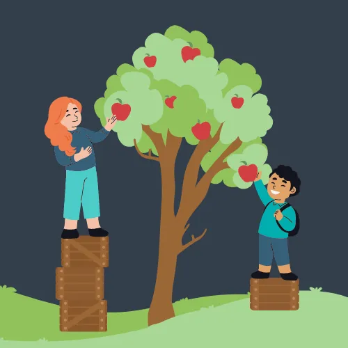 With equity, each child is given the right amount of boxes they need to be able to reach the apples. The girl is given three boxes and the boy is given one – they now can access the same number of apples and neither child is at a disadvantage.