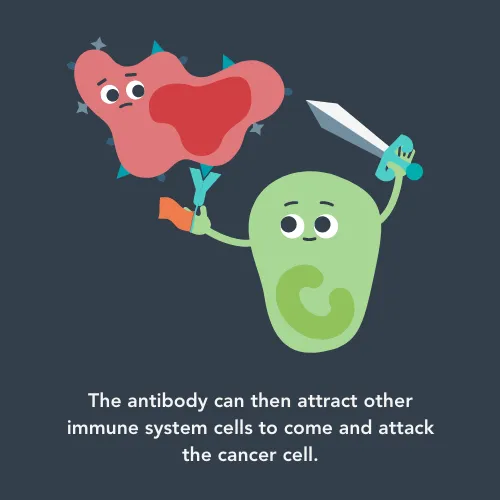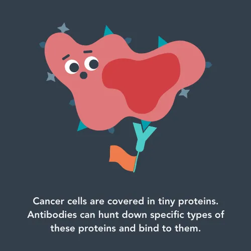 This type of treatment uses a child’s own immune system to fight cancer where the lab-made antibodies (tiny proteins that can hunt down cancer cells based on the proteins on their surfaces) trigger or help the immune system to attack the cancer cell they are bound to.