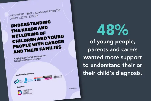 In 2022, we joined forces with Young Lives vs Cancer, Ellen MacArthur Cancer Trust and Teenage Cancer Trust to commission research from the Dartington Service Design Lab to look at where support and care for children and young people with cancer is lacking.
