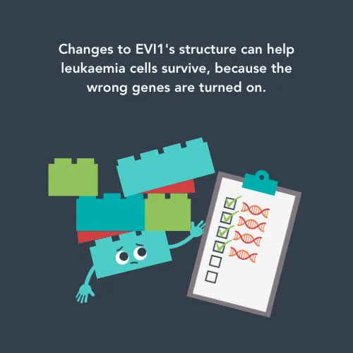 EVI1 is present in some healthy cells too, where it can help maintain the balance between different types of blood cells and ensure that these cells develop properly. Different types of cells need different genes active, so the EVI1 protein can turn a lot of different genes on and off. Whilst this is all important in healthy cells, this amount of power can be dangerous when things go wrong.