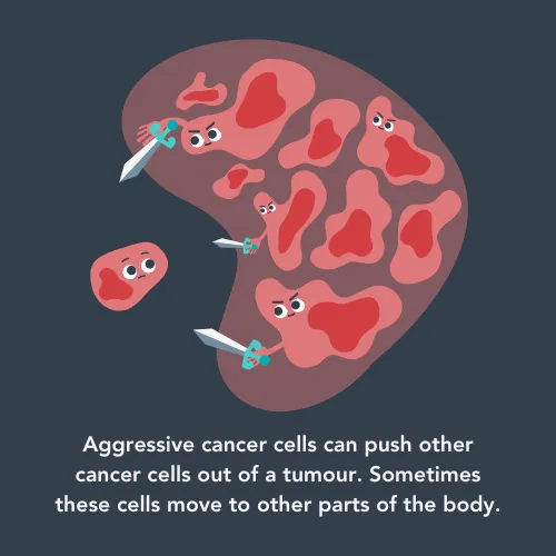 Variation between cancer cells within a tumour could also lead to competition, resulting in the more aggressive cancer cells taking over the tumour. However, less fit cancer cells aren’t always killed – sometimes they’re just pushed out of the tumour to fend for themselves. Recent research suggests that these cells, whilst not as aggressive as their competitors, can sometimes find a new home elsewhere in the body, causing new tumours.