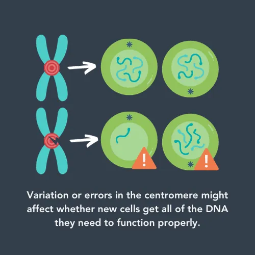If there are errors in the centromeres, it could affect how much DNA each cell gets. This could lead to the new cells not working properly. For cancer cells, this could affect how aggressive they are or whether they respond to treatment.